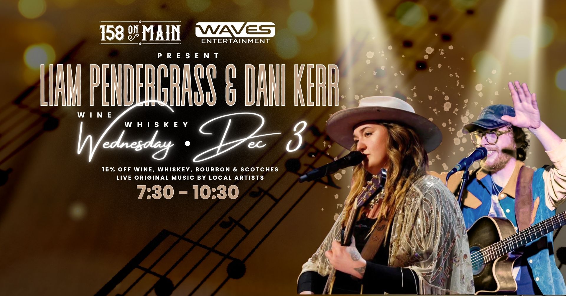 Dec 3rd is Original Music Night and Wine Whiskey Wednesday! Enjoy 15% off all wine, whiskey, bourbon, and scotch while Liam Pendergrass and Dani Kerr—two incredibly talented songwriters—take the stage from 7:30–10:30!